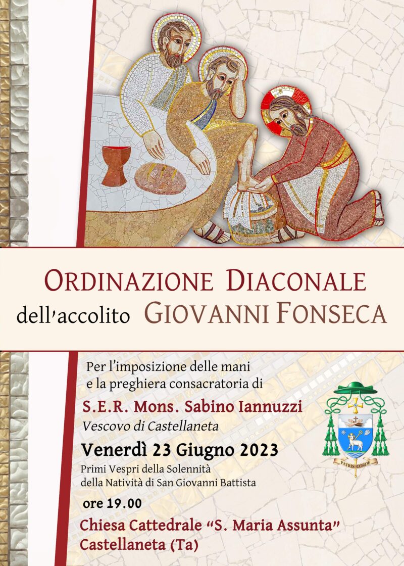Venerdì 23 Giugno 2023, Primi Vespri della Solennità della Natività di San Giovanni Battista, alle ore 19.00 presso la Chiesa Cattedrale “S. Maria Assunta” di Castellaneta, per l’imposizione delle mani e la preghiera consacratoria di S.E.R. Mons. Sabino Iannuzzi, Vescovo di Castellaneta, sarà ordinato Diacono l’Accolito