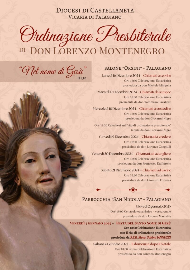 Venerdì 3 Gennaio 2024 alle ore 18:00 presso la Parrocchia San Nicola di Palagiano, S.E.R. Mons. Sabino Iannuzzi, Vescovo di Castellaneta, ordinerà presbitero il Diacono Don Lorenzo Montenegro.