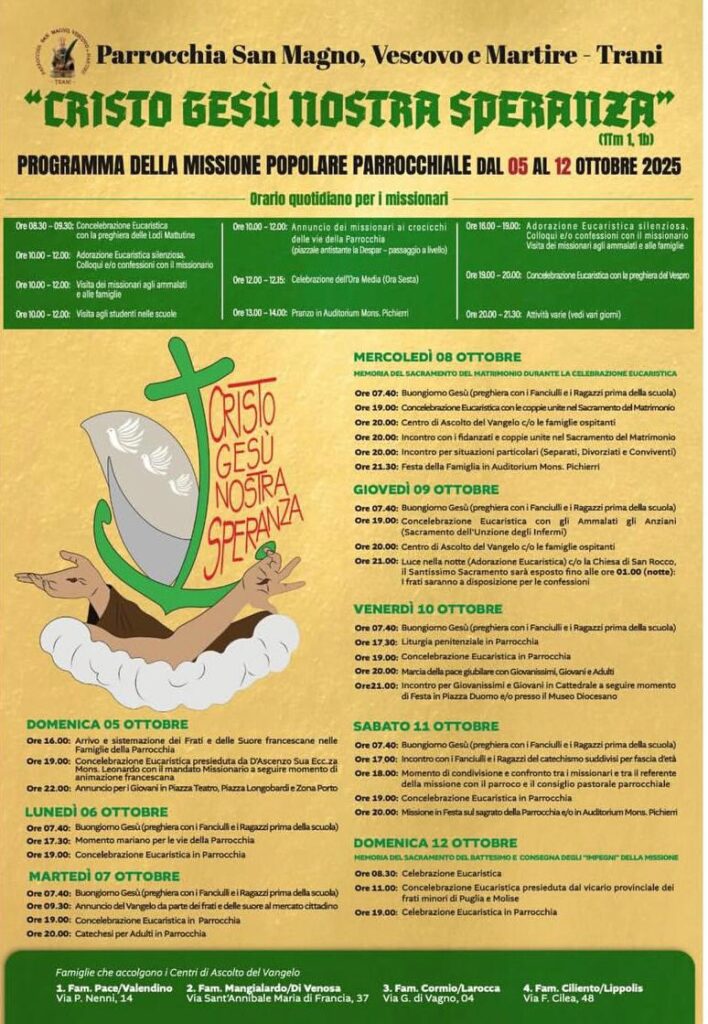 Avrà inizio il prossimo 5 Ottobre alle ore 19.00 con la solenne Celebrazione Eucaristica presieduta da S.E. Mons. Leonardo D’Ascenzo la seconda Missione Popolare della Parrocchia San Magno, Vescovo e Martire. Nel corso della celebrazione, che si terrà presso la Chiesa Parrocchiale, l’Arcivescovo consegnerà il Mandato ai 30 Missionari, Frati e Suore Francescani e ragazzi della Gioventù Francescana, provenienti da tutta la Penisola, che per … Continua a leggere