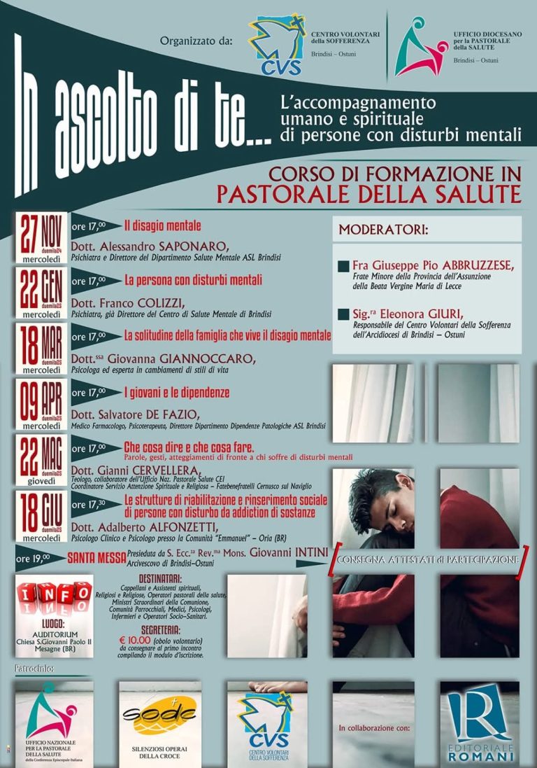 Vi aspettiamo per il prossimo appuntamento del percorso formativo in Pastorale della Salute, “In ascolto di te”, sull’accompagnamento umano e spirituale della persona con disturbi mentali, organizzato dall’Ufficio Diocesano di Pastorale della Salute insieme al Centro Volontari della Sofferenza.