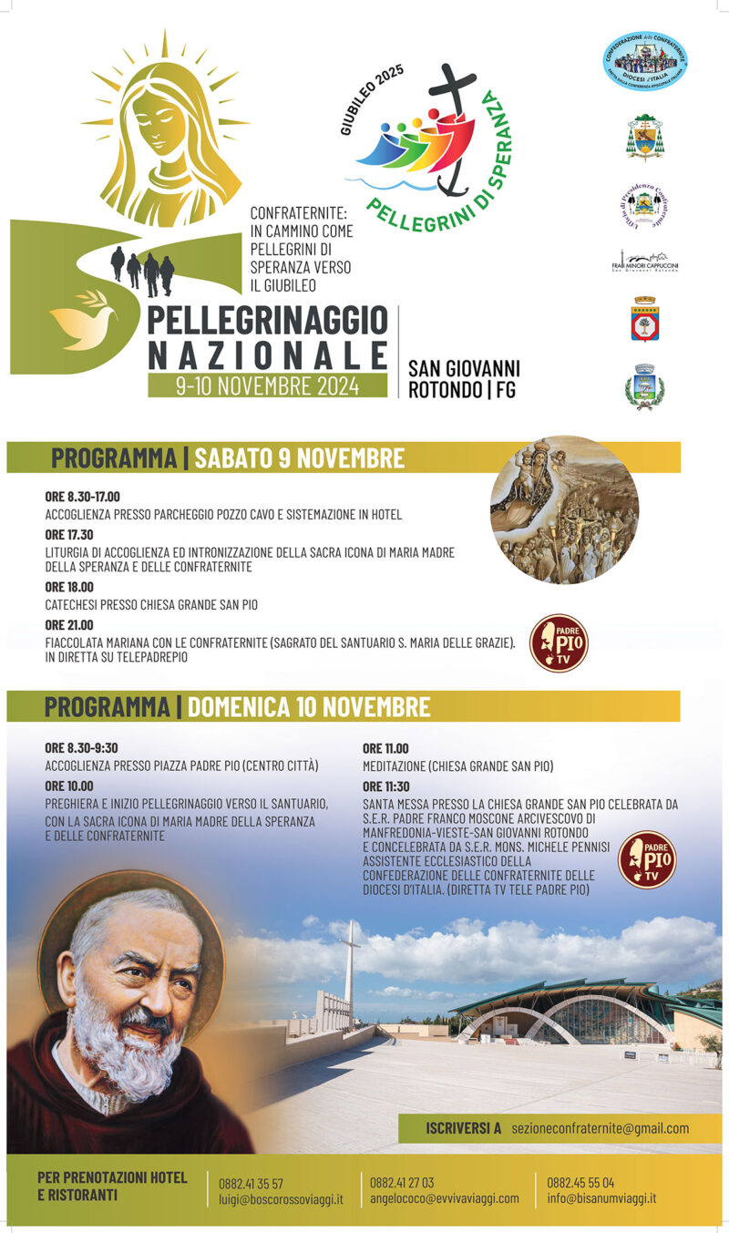 La lettera di invito è a firma del presidente nazionale, il dott. Rino Bisignano: «La nostra Confederazione delle Confraternite delle Diocesi d’Italia ha indetto un Pellegrinaggio Nazionale di carattere formativo al Santuario Pontificio di San Giovanni Rotondo per sabato 9 e domenica 10 novembre 2024 sul tema: “Confraternite in cammino come pellegrini di speranza verso Giubileo”. Questo pellegrinaggio si collega al cammino sinodale della Chiesa Universale e delle Chiese in Italia e alla preparazione al Giubileo del 2025, momento forte della vita della Chiesa, che prevede dal 16 al 18 maggio del 2025 il Giubileo delle Confraternite. In questo pellegrinaggio in un luogo di santità antica e contemporanea per la presenza del Santuari dedicati all’Arcangelo Michele e a San Pio di Pietrelcina ci accompagnerà l’icona di Maria SS. “Madre della Speranza e delle Confraternite”, pellegrina per le varie regioni dell’Italia, che in occasione del pellegrinaggio sarà accolta a San Giovanni Rotondo. Mentre esprimo la comune soddisfazione per l’annunciata canonizzazione del Beato Pier Giorgio Frassati, Patrono delle Confraternite delle Diocesi Italiane, invoco su tutti i membri della nostra Confederazione l’intercessione di Maria SS. Madre della Speranza e delle Confraternite, di San Pio da Pietrelcina e del Beato Pier Giorgio Frassati».