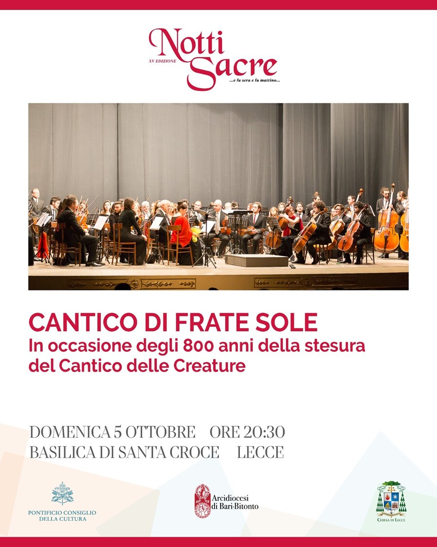 L’omaggio è a San Francesco e alla sua spiritualità universale con la terza tappa leccese della terza edizione di “Notti sacre”, rassegna di musica sacra nata a Bari da un’idea di mons. Antonio Parisi, e giunta a Lecce alla sua terza edizione.