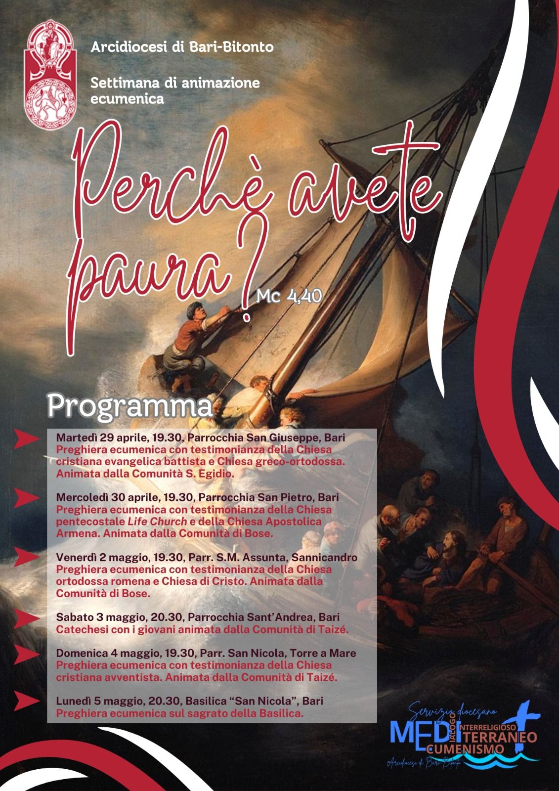 - Martedì 29 aprile, ore 19.30, Parrocchia San Giuseppe, Bari: Preghiera ecumenica con testimonianza della Chiesa cristiana evangelica battista e Chiesa greco-ortodossa. Animata dalla Comunità di S. Egidio