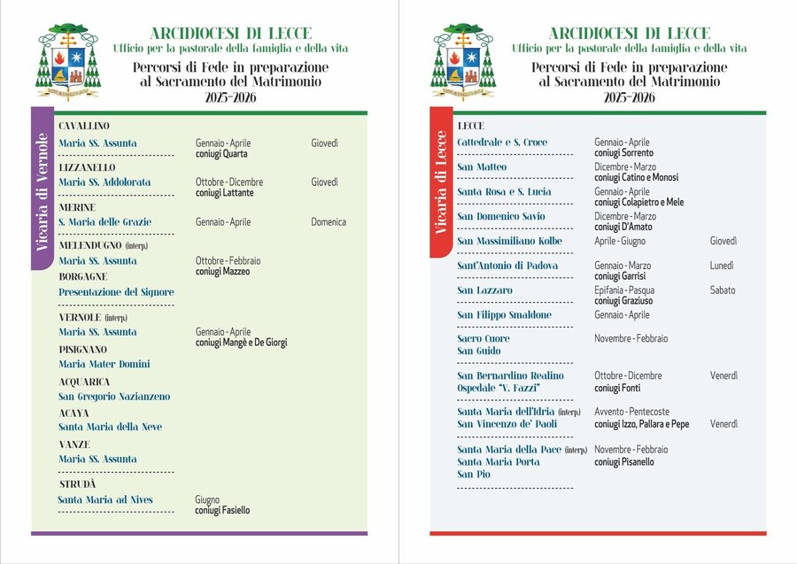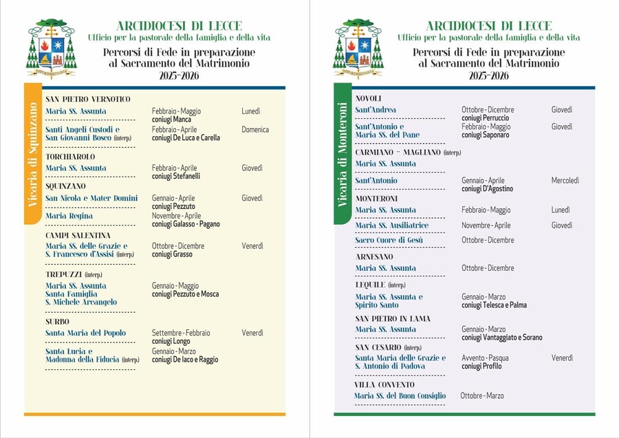 Il percorso verso il matrimonio è un momento in cui riflettere sul passo che si sta per compiere e rafforzare la scelta di celebrare in Chiesa il matrimonio, ma anche un momento di confronto con altre coppie che hanno scelto di intraprendere lo stesso cammino e, allo stesso tempo, un’occasione per ascoltare la Parola di Dio e lasciarsi, da questa, interrogare. Per questo l’arcidiocesi, grazie all’Ufficio diocesano della pastorale familiare e della vita diretto da don Giovanni Serio, parroco di Santa Maria della Porta in Lecce, ha pubblicato il calendario di quest’anno (VEDI SOTTO) con tutti gli incontri nelle quattro vicarie della diocesi e nelle diverse comunità in cui si svolgerà il percorso di fede in preparazione al sacramento del matrimonio.