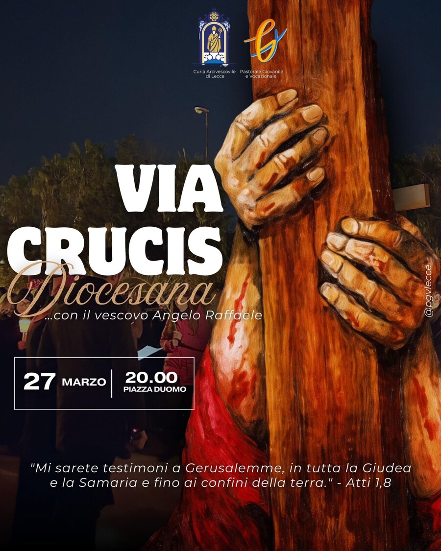 Venerdì 27 marzo a partire dalle 20, la Chiesa di Lecce vivrà un particolare momento di riflessione e meditazione durante la Via Crucis, voluta dal Servizio diocesano di pastorale giovanile e vocazionale ed animata da diverse realtà presenti in diocesi.