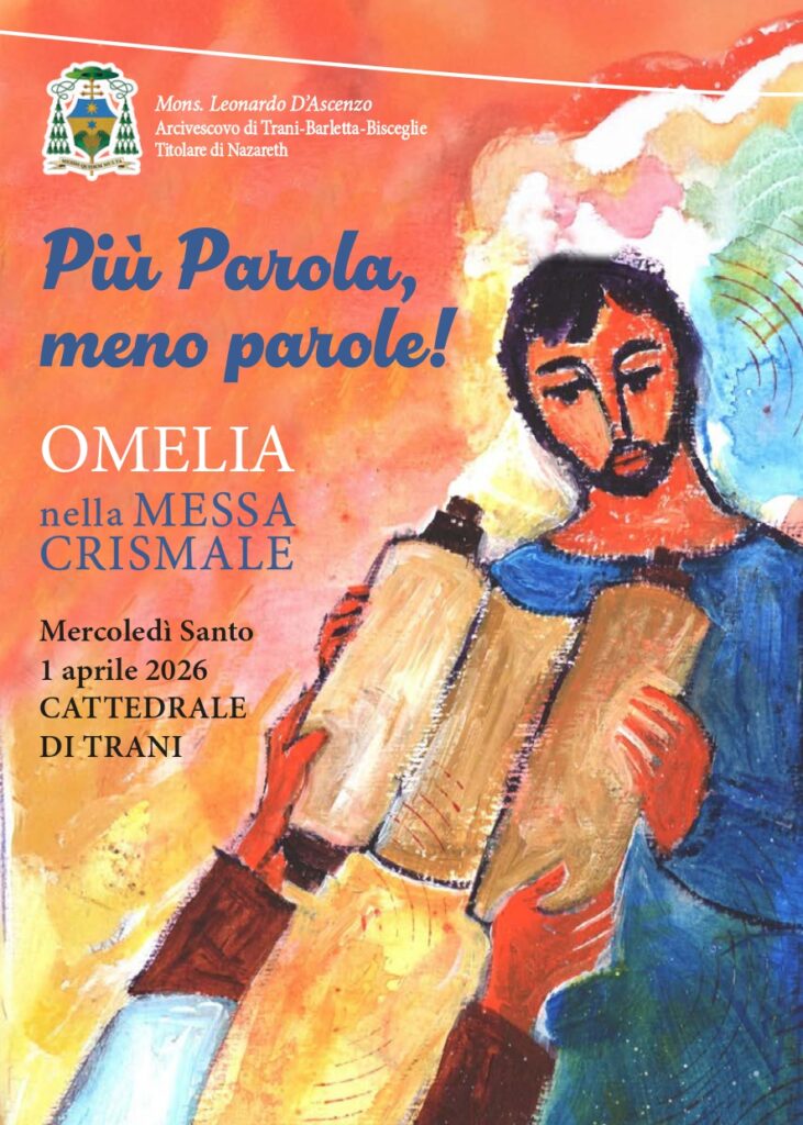 Scarica l’omelia della messa crismale Più Parola, meno parole! OMELIA nella MESSA CRISMALE Mercoledì Santo – 1 aprile 2026 Cattedrale di Trani In quel tempo, Gesù venne a Nazaret, dove era cresciuto, e secondo il suo solito, di sabato, entrò nella sinagoga». Anche oggi, secondo il suo solito, Gesù viene in mezzo a noi nella Parola e nel pane e vino consacrati. È bello … Continua a leggere