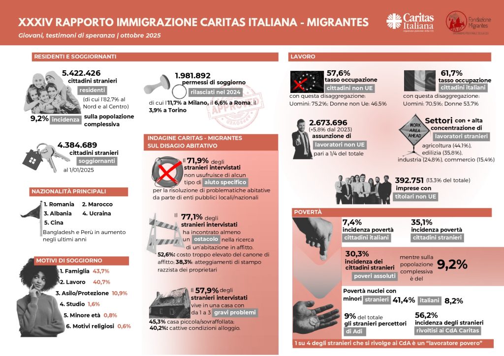 Il Rapporto 2025 mette al centro i giovani di origine straniera, protagonisti silenziosi di una trasformazione profonda della società italiana. In Italia gli stranieri residenti superano i 5,4 milioni (9,2% della popolazione) e oltre il 21% dei nuovi nati ha almeno un genitore straniero: dati che descrivono un Paese sempre più plurale e interconnesso. Il volume — 392 pagine con il contributo di 48 studiosi — analizza la realtà migratoria attraverso otto ambiti della vita quotidiana, tra cui scuola, lavoro, sanità, sport e appartenenza religiosa, evidenziando opportunità e criticità dei percorsi di inclusione.