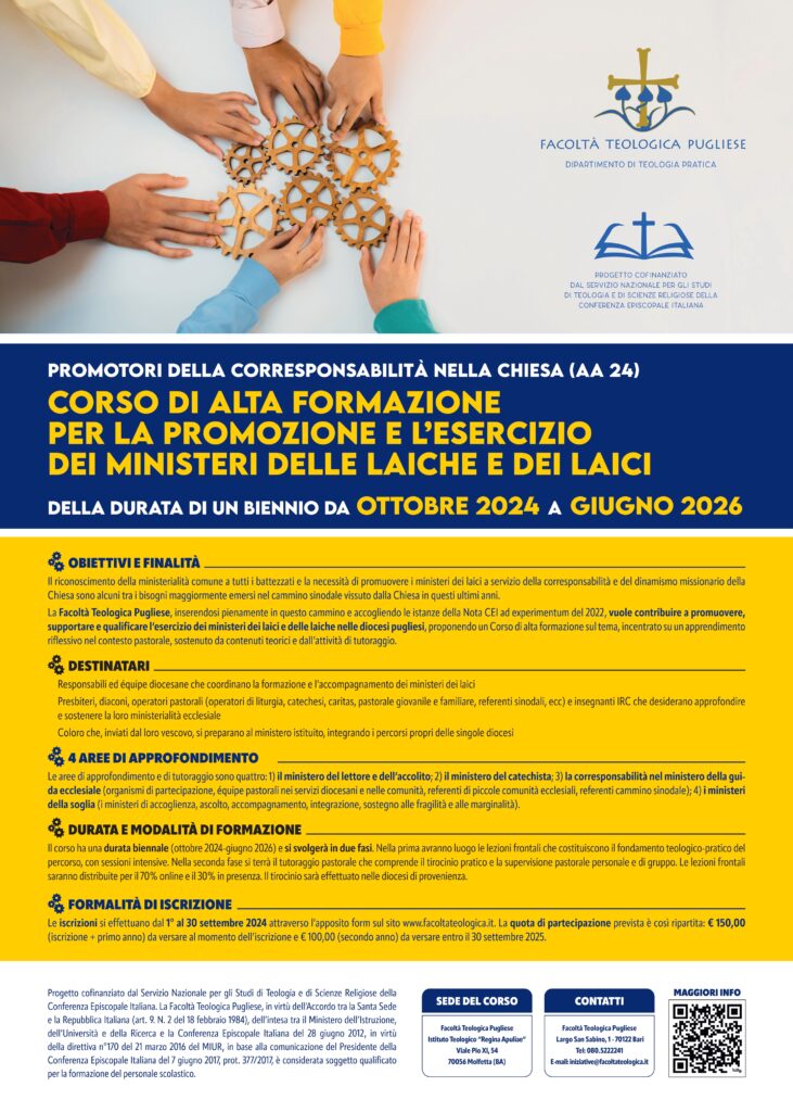 La Facoltà Teologica Pugliese propone il Corso di alta formazione per la promozione e l’esercizio dei ministeri dei laici “Promotori della corresponsabilità nella Chiesa”.