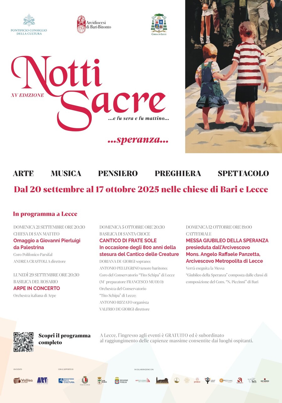 Una collaborazione capace di mettere insieme Bari e Lecce, “se non a livello calcistico almeno a livello ecclesiale, grazie a un viaggio musicale e spirituale capace di unire la profondità della tradizione e il fascino della contemporaneità. Perché la musica fa bene a tutti, e in mondo a volte pesante come questo ci aiuta ad alzare gli occhi al cielo”, ha aggiunto don Antonio Parisi, ideatore della rassegna. “Un’esperienza che, siamo certi, lascerà nel cuore del pubblico un segno di armonia, pace e meraviglia”. “Non semplicemente un festival di musica sacra, ma uno strumento di evangelizzazione in linea con quanto proposto da Papa Francesco nell’esortazione “Evangelii gaudium”, sottolinea nella brochure di presentazione della rassegna l’arcivescovo Panzetta, “dal momento che “annunciare Cristo significa mostrare che credere in Lui e seguirlo non è solamente una cosa vera e giusta, ma anche bella, capace di colmare la vita di un nuovo splendore e di una gioia profonda, anche in mezzo alle prove”.
