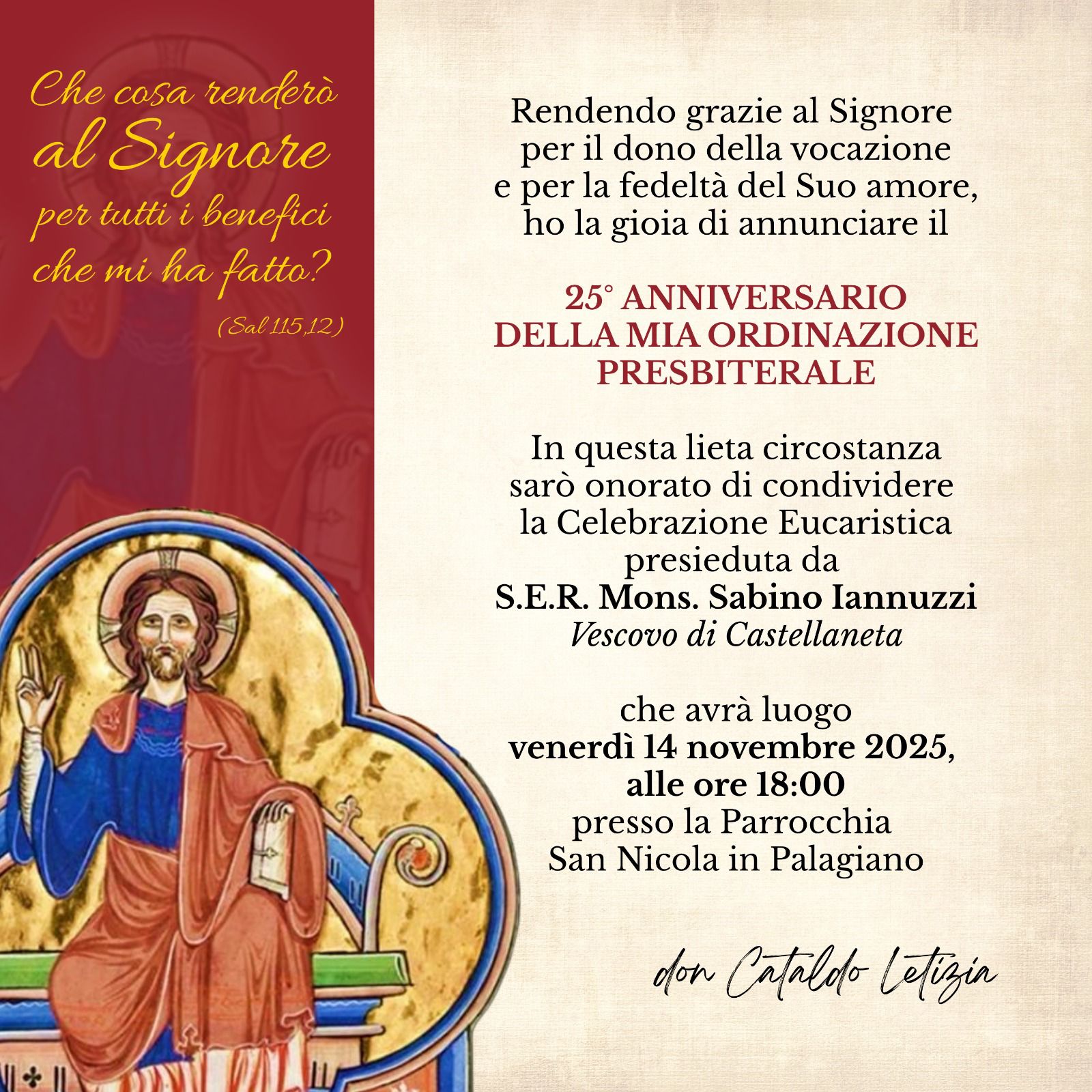 Venerdì 14 Novembre 2025 alle ore 18:00 presso la Parrocchia San Nicola di Palagiano, Mons. Sabino Iannuzzi presiederà la Celebrazione Eucaristica in occasione del 25° anniversario di sacerdozio di don Cataldo Letizia.