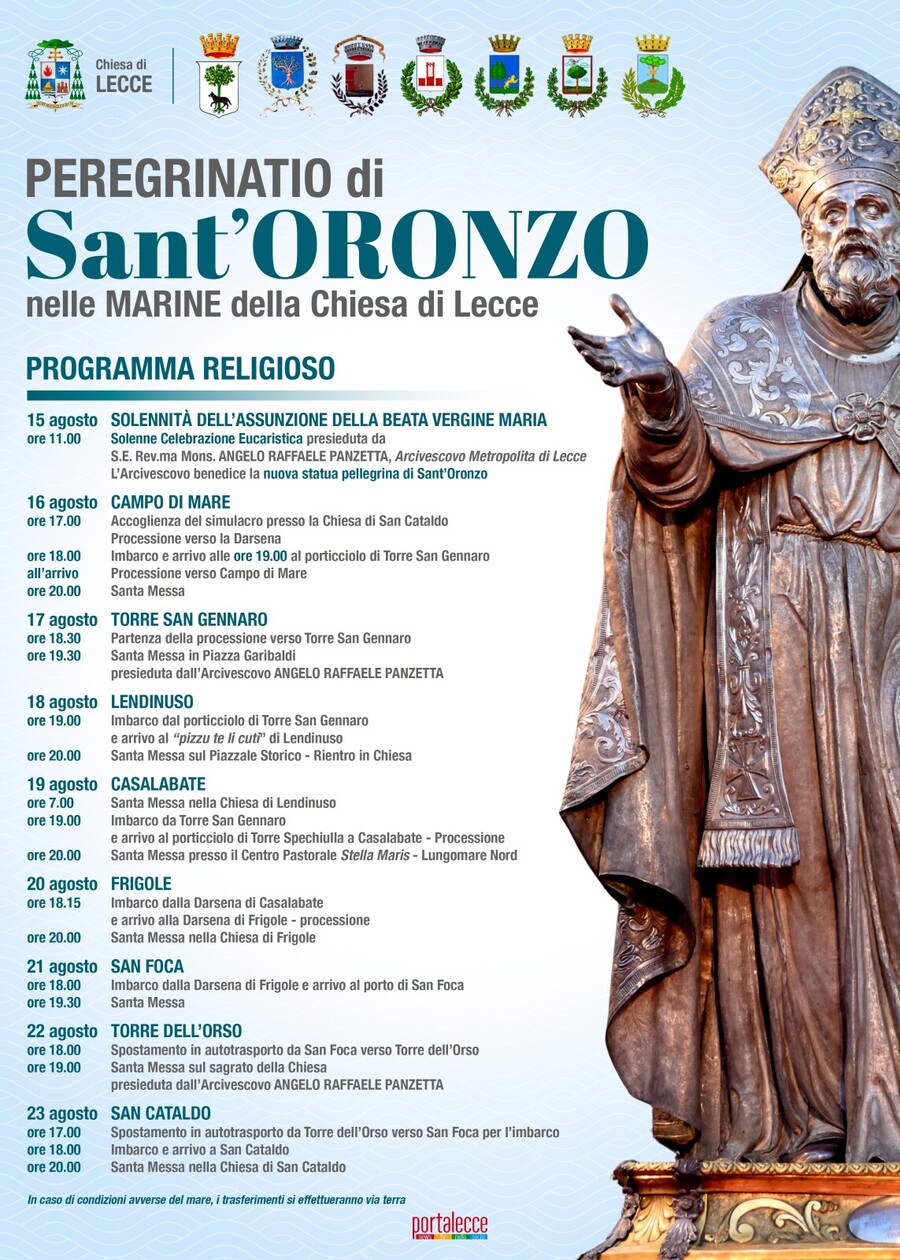 Ultima tappa della peregrinatio sabato 23 agosto. Il simulacro di Sant’Oronzo, nel pomeriggio, ritornerà a San Foca per l’imbarco, alle 18,30, per tornare a San Cataldo, dove. don Corrado Serafino, alle 20, presiederà la messa prefestiva.