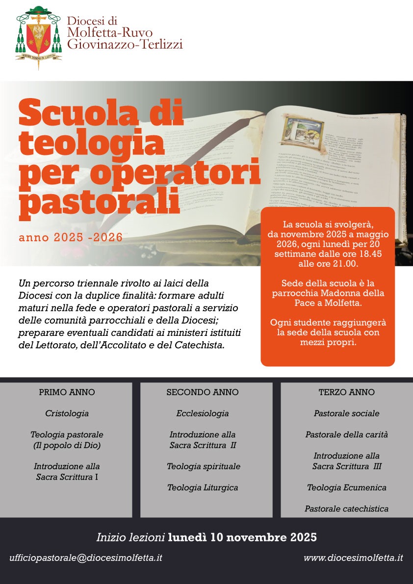 Sono aperte le iscrizioni per partecipare alla Scuola di teologia per i operatori pastorali promossa dalla diocesi di Molfetta-Ruvo-Giovinazzo-Terlizzi. La scuola è rivolta a tutti i laici della Diocesi con la duplice finalità di: formare adulti maturi nella fede e operatori pastorali a servizio delle comunità parrocchiali e della Diocesi e preparare eventuali candidati ai ministeri istituiti del Lettorato, dell’Accolitato e del Catechista.