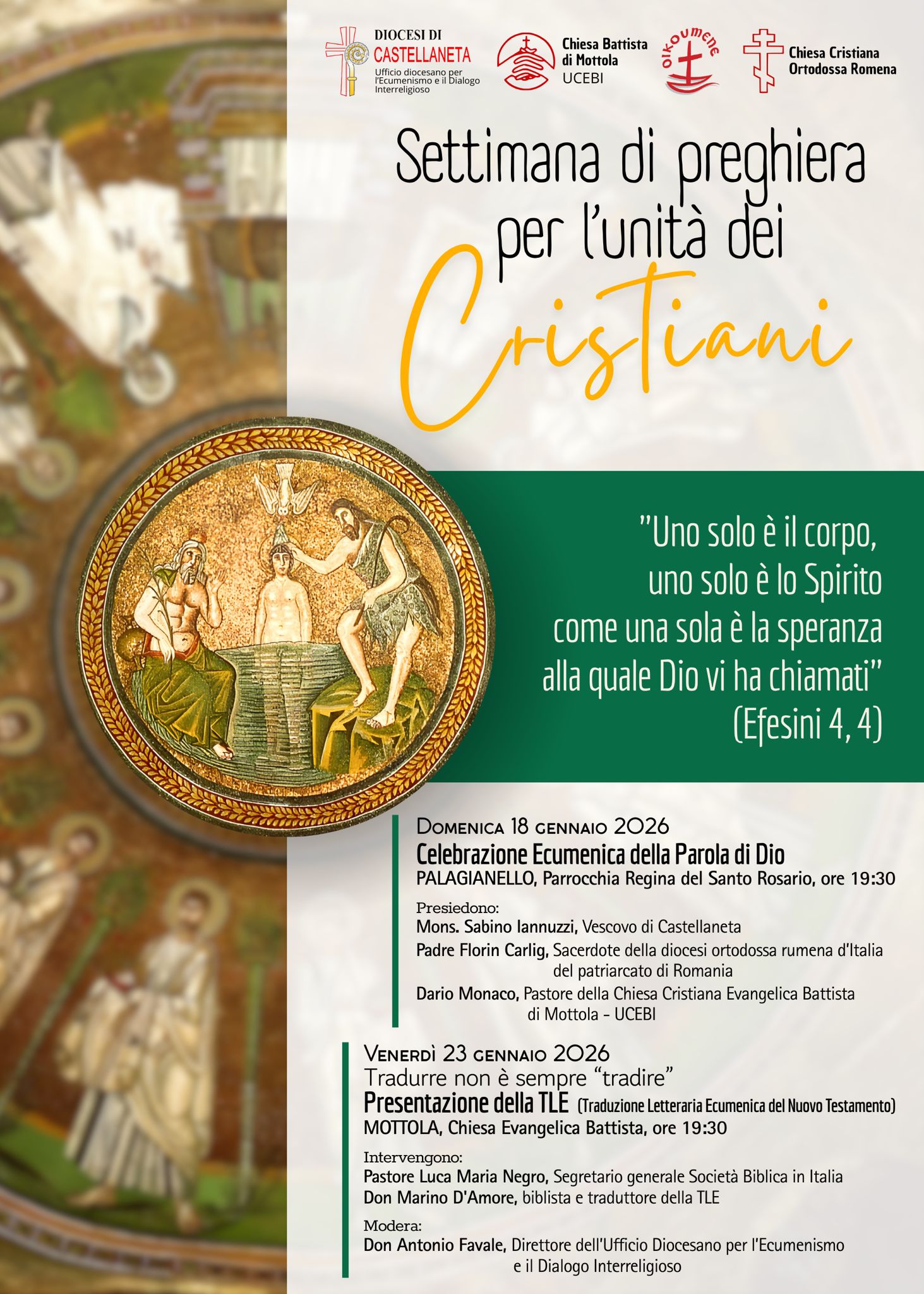 L’Ufficio Diocesano per l’Ecumenismo ed il Dialogo Interreligioso, in occasione della Settimana di Preghiera per l’Unità dei Cristiani 2026 che avrà come tema “Uno solo è il corpo, uno solo è lo Spirito come una sola è la speranza alla quale Dio vi ha chiamati” (Ef 4, 4) ha preparato una serie di eventi celebrativi e culturali.