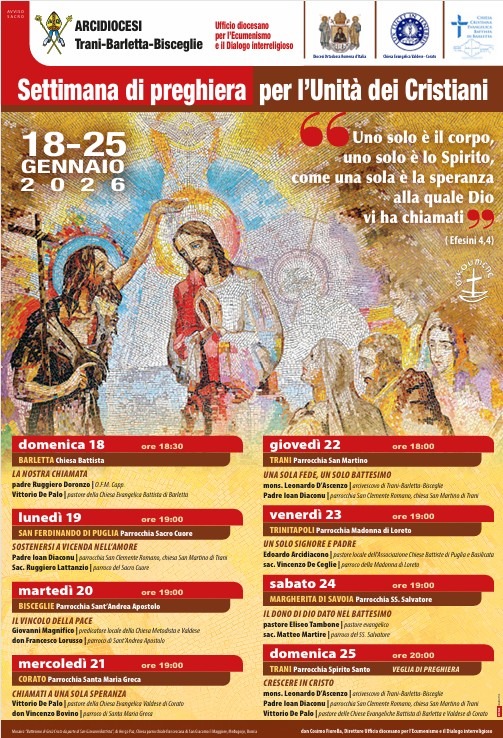 L’Arcidiocesi di Trani-Barletta-Bisceglie, a cura dell’Ufficio diocesano per l’Ecumenismo e il Dialogo interreligioso con direttore don Cosimo Fiorella, promuove la Settimana di preghiera per l’Unità dei Cristiani, in programma dal 18 al 25 gennaio. L’iniziativa si inserisce nel cammino ecumenico della Chiesa universale e richiama il tema biblico scelto per quest’anno: “Uno solo è il corpo, uno solo è lo Spirito, come una sola è … Continua a leggere