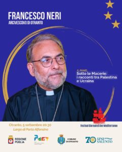 La terza giornata della diciassettesima edizione del Festival Giornalisti del Mediterraneo, in corso a Otranto in Largo Porta Alfonsina, in media partnership con Ansa, Radio Vaticana, Vatican News, vedrà questa sera la partecipazione dell’Arcivescovo Francesco Neri. Alle ore 20:30 è infatti previsto il panel “Sotto le macerie: i racconti tra Palestina e Ucraina”.