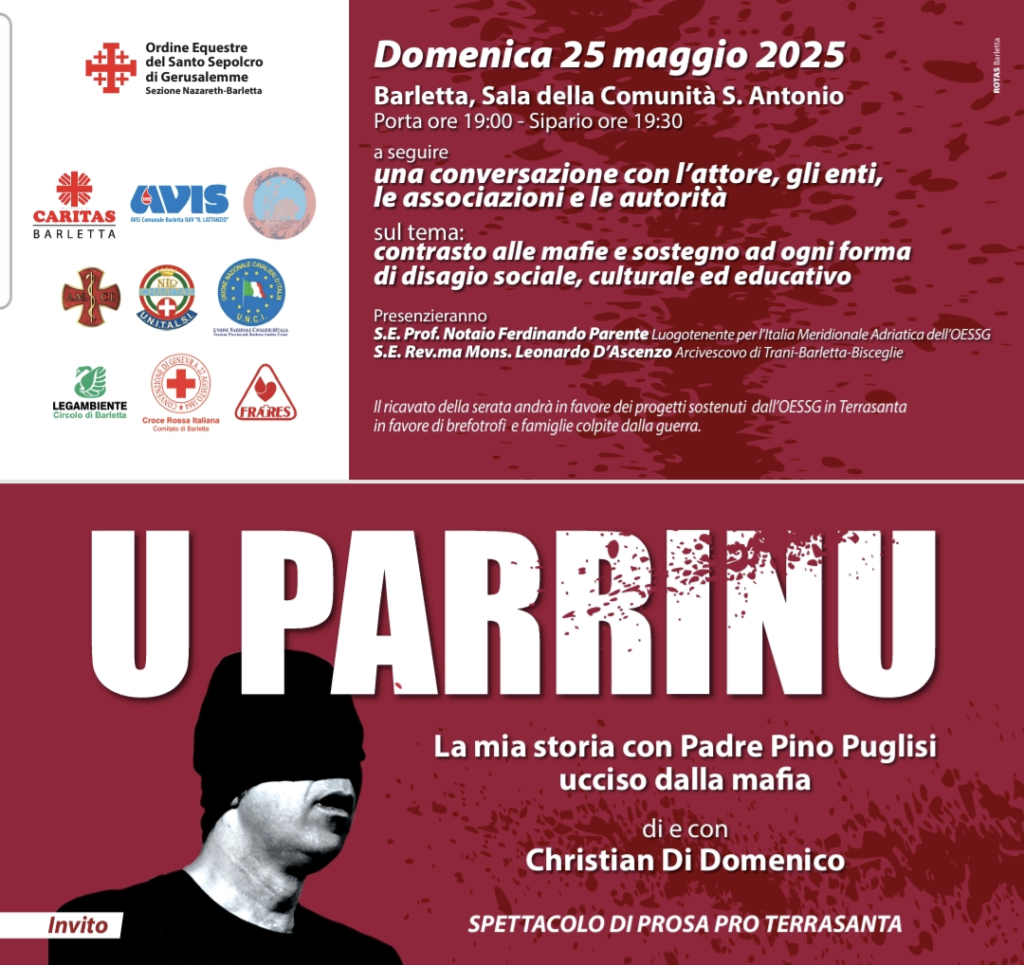 Teatro e testimonianza per la legalità e la solidarietà: a Barletta lo spettacolo “U Parrinu” Un’occasione di riflessione, memoria e impegno civile si terrà domenica 25 maggio 2025 presso la Sala della Comunità Sant’Antonio a Barletta, grazie all’iniziativa promossa dalla Sezione Nazareth-Barletta dell’Ordine Equestre del Santo Sepolcro di Gerusalemme, con il sostegno di numerose realtà del territorio. A partire dalle ore 19:00, con inizio … Continua a leggere