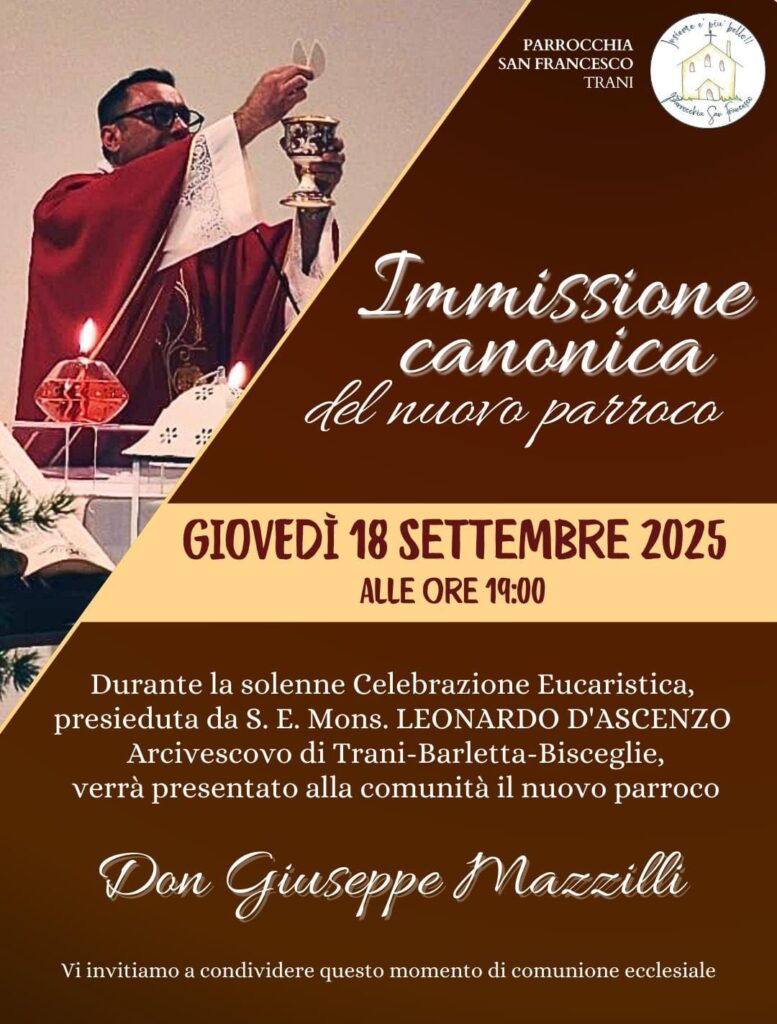 Giovedì 18 settembre 2025, a Trani, nella parrocchia San Francesco, si terrà la celebrazione eucaristica presieduta dall’Arcivescovo mons. Leonardo D’Ascenzo per l’inizio del ministero pastorale del Parroco Don Giuseppe Mazzilli“. Di seguito il profilo biografico del sacerdote, nuovo parroco di San Francesco. Don Giuseppe Mazzilli nasce l’8 dicembre del 1973. Nel 1995 partecipa alla giornata mondiale della gioventù svoltasi a Loreto, dove attraverso la … Continua a leggere