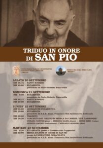 Nella Chiesa Maria Ss. di Costantinopoli a Maglie, Convento dei Frati Cappuccini, il 20 settembre comincerà il Triduo in onore di san Pio. La Messa Solenne del 23 settembre, giorno della festa, presieduta da Mons. Francesco Neri, si svolgerà invece, alle ore 19, presso la Parrocchia Immacolata.