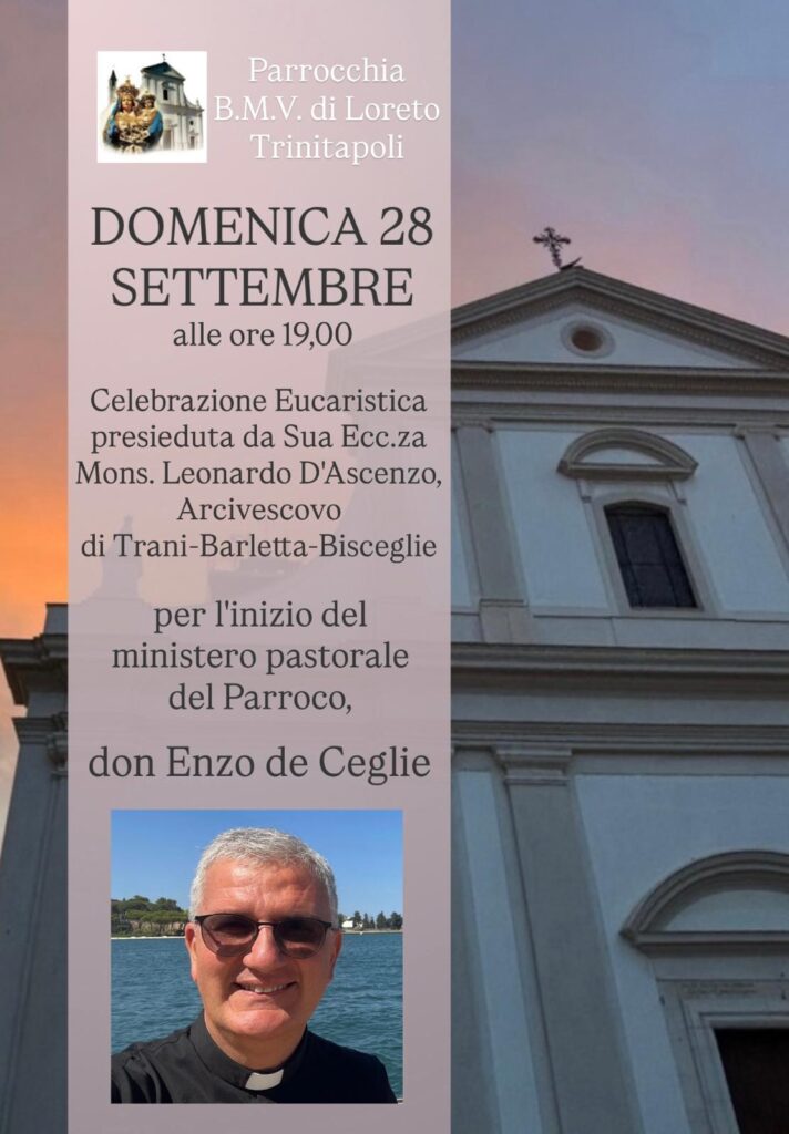 Domenica 28 settembre 2025, a Trinitapoli, nella parrocchia B.M.V. di Loreto, alle ore 19.00, si terrà la celebrazione eucaristica presieduta dall’Arcivescovo mons. Leonardo D’Ascenzo per l’inizio del ministero pastorale del Parroco Don Enzo de Ceglie Di seguito il profilo biografico del sacerdote, nuovo parroco: Don Enzo de Ceglie, tranese, 56 anni, sacerdote da 31, si è formato nella parrocchia degli Angeli Custodi a Trani, … Continua a leggere