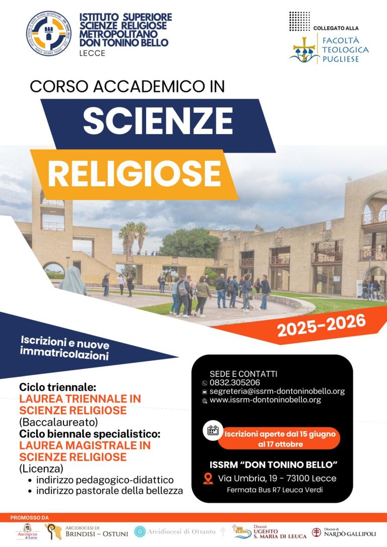Dal 1° settembre sono aperte le iscrizioni all’Istituto Superiore di Scienze Religiose Metropolitano “Don Tonino Bello” di Lecce, in vista dell’inizio del nuovo anno accademico fissato per il 6 ottobre 2025.