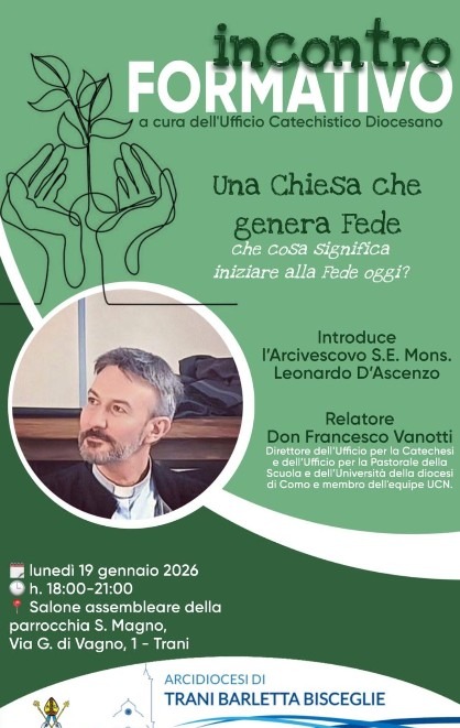 Un’occasione di riflessione e approfondimento sul compito educativo della comunità ecclesiale è in programma a Trani con l’incontro formativo promosso dall’Ufficio Catechistico Diocesano dell’Arcidiocesi di Trani-Barletta-Bisceglie. L’appuntamento, dal titolo “Una Chiesa che genera fede. Che cosa significa iniziare alla fede oggi?”, si inserisce nel percorso di formazione rivolto in modo particolare ai catechisti e agli operatori pastorali, chiamati a confrontarsi con le sfide dell’annuncio cristiano … Continua a leggere