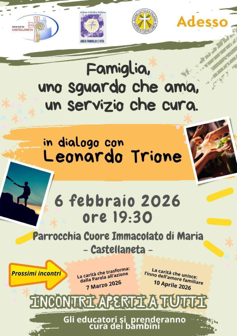 Venerdì 6 Febbraio 2026 alle ore 19:30 presso la Parrocchia Cuore Immacolato di Maria in Castellaneta il primo appuntamento del ciclo di incontri promosso dall’Area Famiglia e Vita dell’Azione Cattolica diocesana sul tema “Famiglia: uno sguardo che ama, un servizio che cura”. Ospite della serata il Dott. Leonardo Trione.
