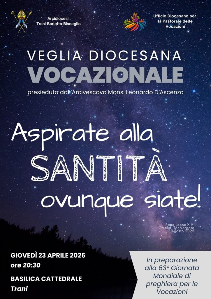 VEGLIA DIOCESANA VOCAZIONALE Aspirate alla Santità, ovunque siate! Giovedì 23 aprile 2026 alle ore 20.30, presso la Basilica Cattedrale di Trani, tutta la comunità diocesana è chiamata a partecipare alla veglia di preghiera presieduta dall’arcivescovo Mons. Leonardo D’Ascenzo, in preparazione alla 63^ Giornata Mondiale di preghiera per le Vocazioni. Sarà un momento di grande grazia per tutto il popolo di Dio per poter considerare la … Continua a leggere