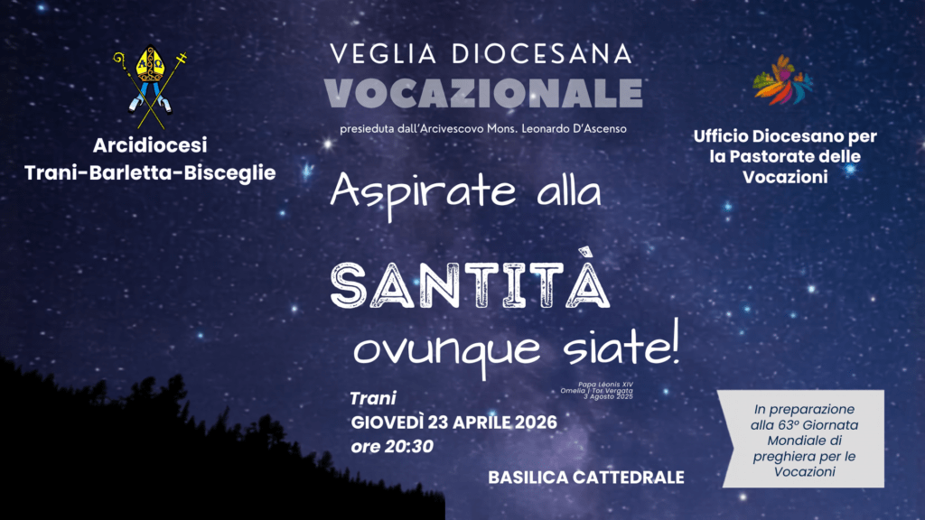 Nella serata del 23 aprile 2026, a Trani, nella Cattedrale, si è tenuta la Veglia diocesana vocazionale promossa dall’Ufficio diocesano di pastorale vocazionale, quale preparazione al cammino di preparazione alla 63^ Giornata Mondiale di preghiera per le vocazioni sul tema “Aspirate alla santità ovunque siate!”. Nel corso della Veglia, dopo la testimonianza di una novizia della congregazione delle Suore Alcantarine e di una coppia, mons. … Continua a leggere