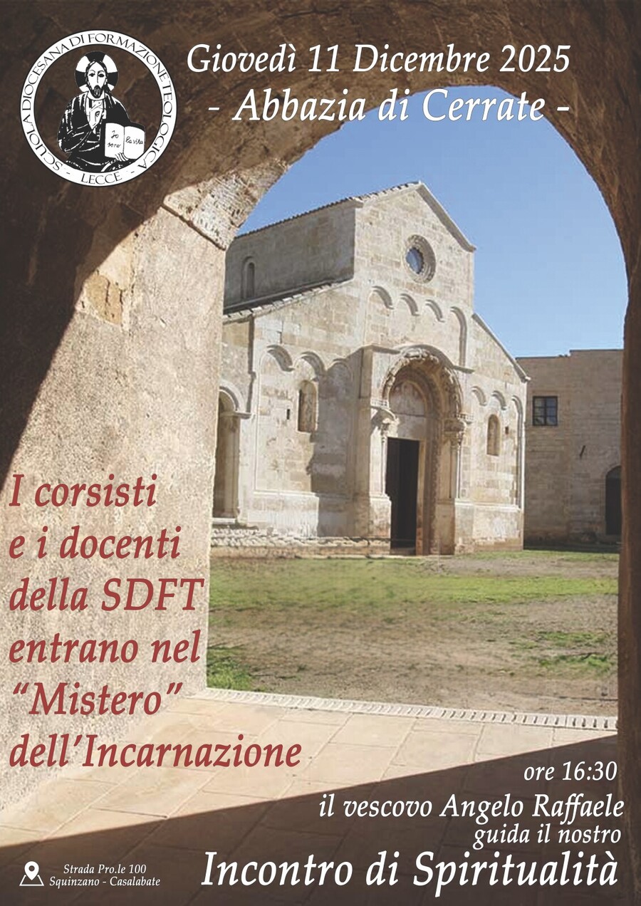 Questo ambiente suggestivo, affidato oggi alle cure del Fai, diventa il “grembo” spirituale in cui i partecipanti alla Scuola diocesana di formazione teologica potranno riscoprire la logica dell’Incarnazione: un Dio che entra nella storia, nella concretezza dello spazio e del tempo, proprio come l’olio prodotto nell’antico frantoio ipogeo di Cerrate si radicava nella terra salentina. Il tema dell’incontro, il “Mistero dell’Incarnazione”, sarà il faro che illuminerà la riflessione. Giovedì 11 dicembre alle 16,30, guidati dalla sapiente e profonda meditazione dell’arcivescovo Angelo Raffaele Panzetta, i presenti saranno chiamati a contemplare il Verbo che si fa carne, la presenza viva di Dio nelle pieghe della nostra esistenza.