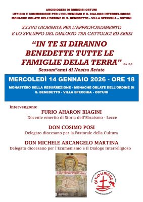 In occasione della XXXVII Giornata per l’approfondimento e lo sviluppo del dialogo tra cattolici ed ebrei, mercoledì 14 gennaio 2026, alle ore 18.00, si terrà un incontro di riflessione presso il Monastero della Resurrezione – Monache Oblate dell’Ordine di San Benedetto, a Villa Specchia (Ostuni).