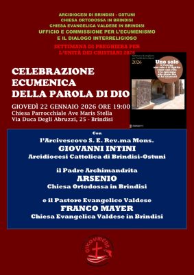 Nel contesto della Settimana di Preghiera per l’Unità dei Cristiani 2026, promossa congiuntamente dall’Arcidiocesi di Brindisi-Ostuni, dalla Chiesa Ortodossa in Brindisi e dalla Chiesa Evangelica Valdese in Brindisi, giovedì 22 gennaio 2026, alle ore 19.00, si terrà una Celebrazione Ecumenica della Parola di Dio presso la Chiesa Parrocchiale Ave Maris Stella, in via Duca degli Abruzzi 25, a Brindisi.