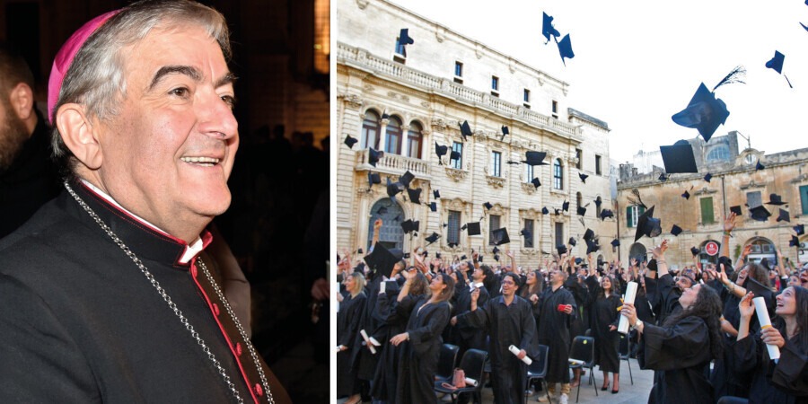Cari giovani laureati, esprimo le mie più vive congratulazioni al vostro rettore e ai suoi collaboratori per aver voluto a Lecce questo bellissimo evento, orgoglioso anche perché hanno scelto questa piazza, una volta identificata come il “Cortile del Vescovado”. Siete dunque, in qualche modo, nella casa del vescovo per vivere questo sereno momento di festa: sentitevi a casa vostra. Non solo stasera ma anche dopo, quando vorrete trascorrere del tempo con me, per raccontarmi i vostri progetti ma anche per confidare le vostre paure: sappiate che questa piazza e la mia casa sono sempre aperte per accogliere tutti. Per accogliere soprattutto voi che oggi iniziate un nuovo percorso di vita: gli anni trascorsi nell’Università del Salento forse per voi rappresentano già il passato. Nuove strade e nuove prospettive ormai si aprono davanti ai vostri occhi: non sia così. I luoghi e le persone che ci hanno aiutati a costruire il nostro futuro non apparteranno mai ad un passato remoto ma resteranno sempre presenti come fari luminosi che ci accompagneranno in ogni momento della vita e faranno luce sul cammino. Non solo doverosa gratitudine, dunque, per chi ha contribuito alla vostra formazione umana e culturale, ma soprattutto, incancellabile memoria che profuma di avvenire.