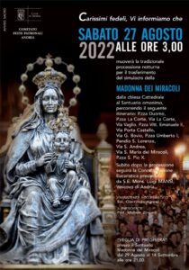 Sabato 27 agosto 2022, alle ore 3:00, muoverà la tradizionale processione notturna per il trasferimento del simulacro della Madonna dei Miracoli, dalla Chiesa Cattedrale al Santuario omonimo, percorrendo il seguente itinerario: p.zza Duomo, p.zza La Corte, via La Corte, via Vaglio, p.zza Vittorio Emanuele II, via Porta Castello, via G. Bovio, piazza Umberto I, Pendio San Lorenzo, via S. Andrea, via S. Maria dei Miracoli, piazza S. Pio X.